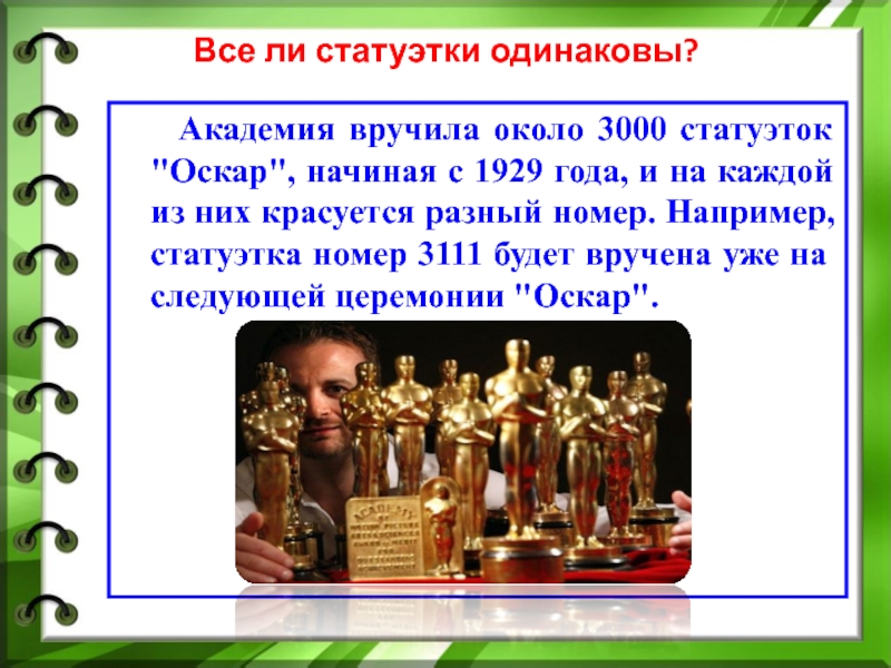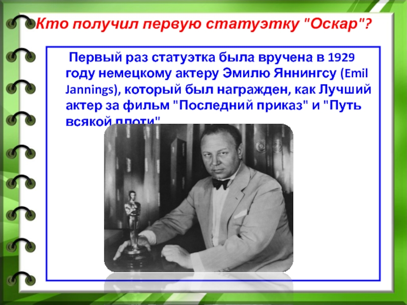 Слайд 10Кто получил первую статуэтку "Оскар"?
