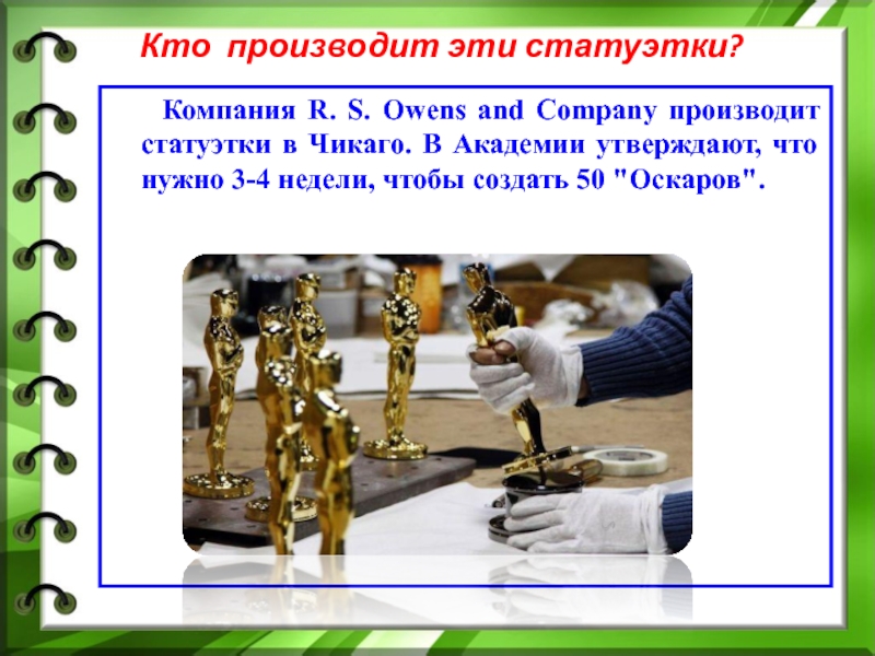 Owens and Company производит статуэтки в Чикаго. В Академии утверждают, что нужно 3-4 недели, чтобы создать 50 "Оскаров".