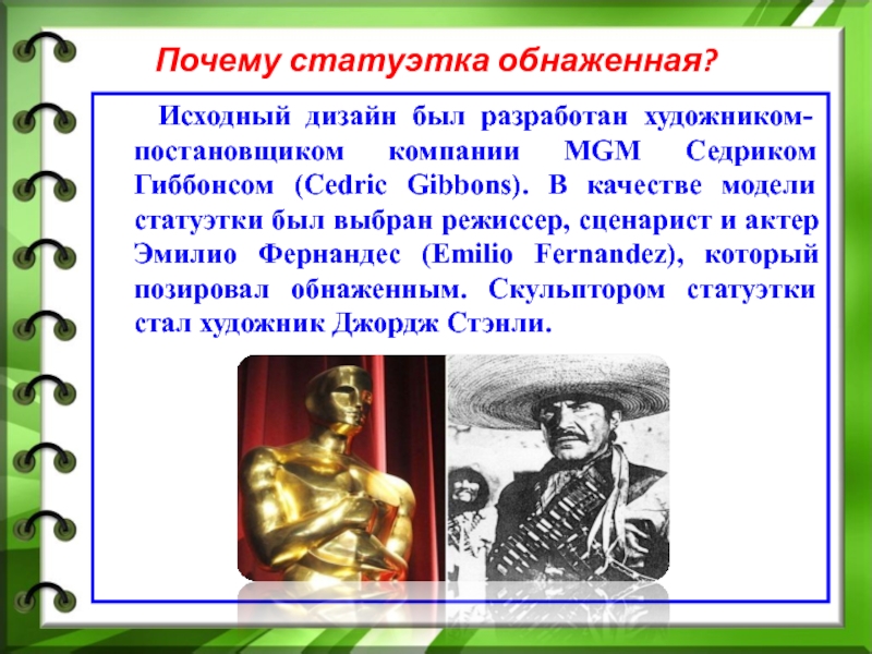MGM Седриком Гиббонсом (Cedric Gibbons). В качестве модели статуэтки был выбран режиссер, сценарист и актер Эмилио Фернандес (Emilio Fernandez), который позировал обнаженным. Скульптором статуэтки стал художник Джордж Стэнли.