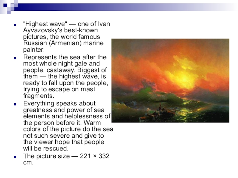 Слайд 9“Highest wave" — one of Ivan Ayvazovsky's best-known pictures, the world