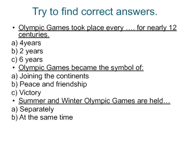 Try to find correct answers.  Olympic Games took place every …. for nearly 12 centuries.a) 4yearsb)
