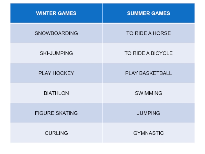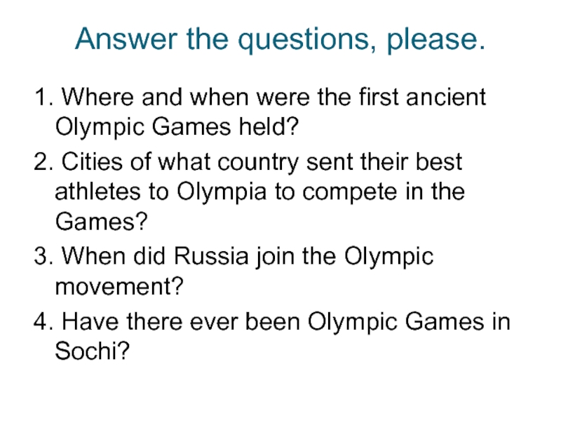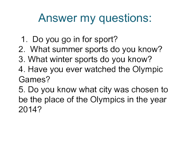 sports do you know? 3. What winter sports do you know? 4. Have you ever watched the Olympic Games? 5. Do you know what city was chosen to be the place of the Olympics in the year 2014?