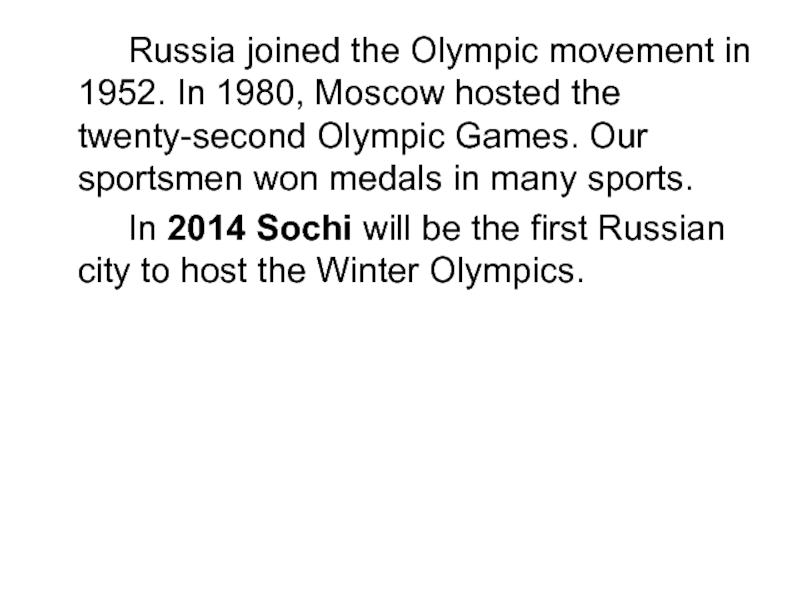 Russia joined the Olympic movement in 1952. In 1980, Moscow hosted the twenty-second Olympic Games. Our sportsmen