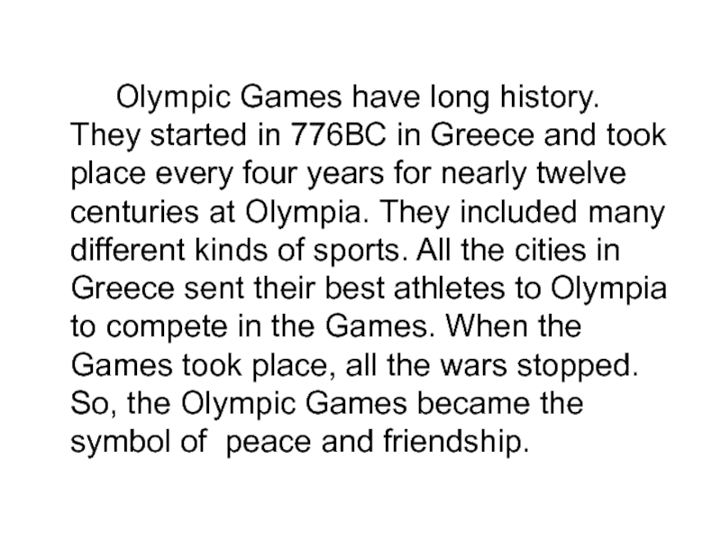and took place every four years for nearly twelve centuries at Olympia. They included many different kinds of sports. All the cities in Greece sent their best athletes to Olympia to compete in the Games. When the Games took place, all the wars stopped. So, the Olympic Games became the symbol of peace and friendship.
