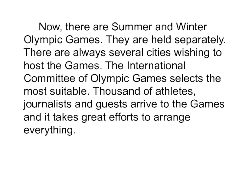 separately. There are always several cities wishing to host the Games. The International Committee of Olympic Games selects the most suitable. Thousand of athletes, journalists and guests arrive to the Games and it takes great efforts to arrange everything.