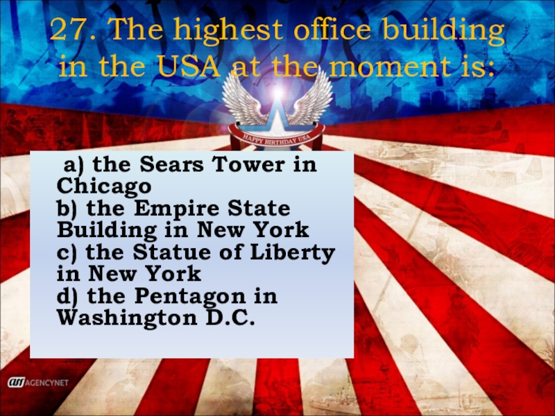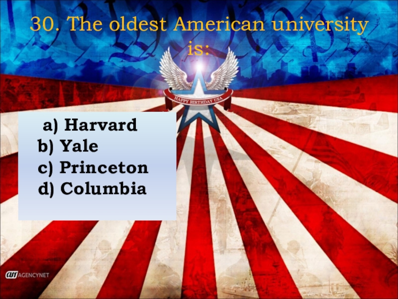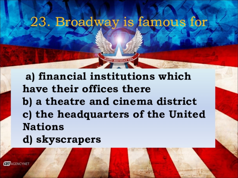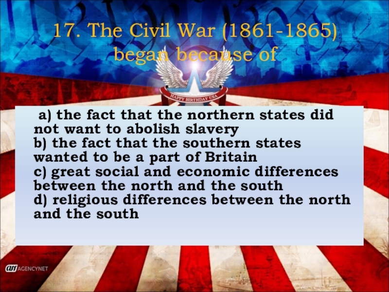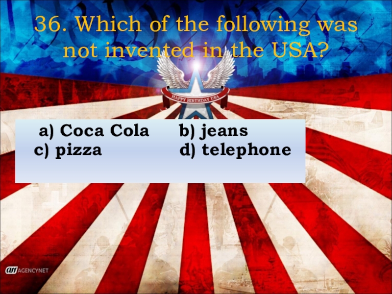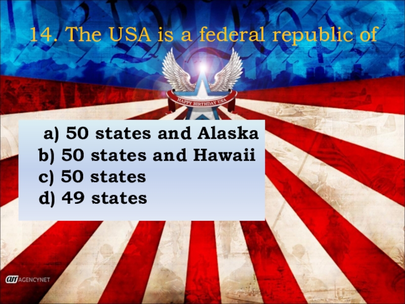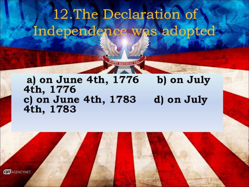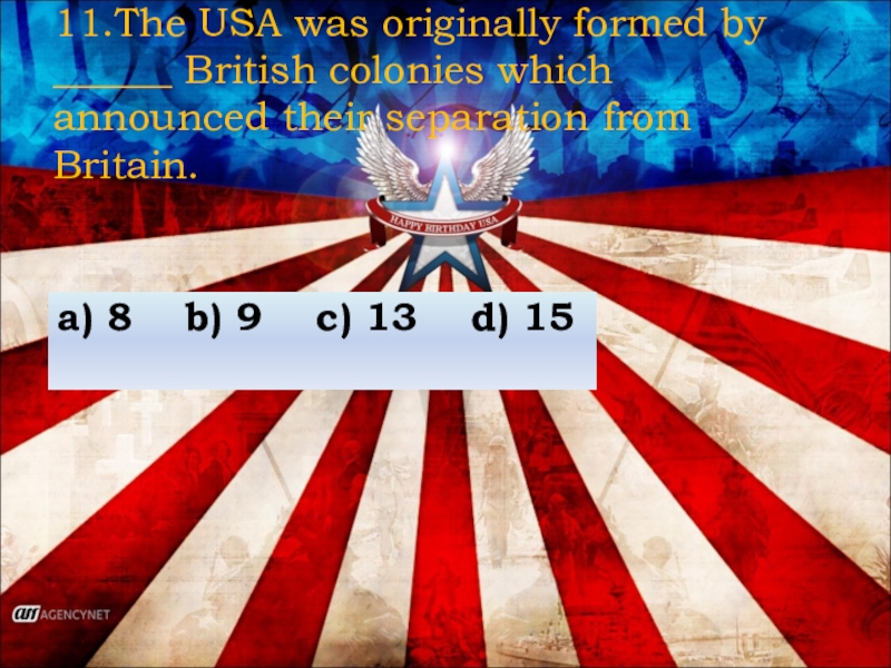 Слайд 1211.The USA was originally formed by ______ British colonies which announced