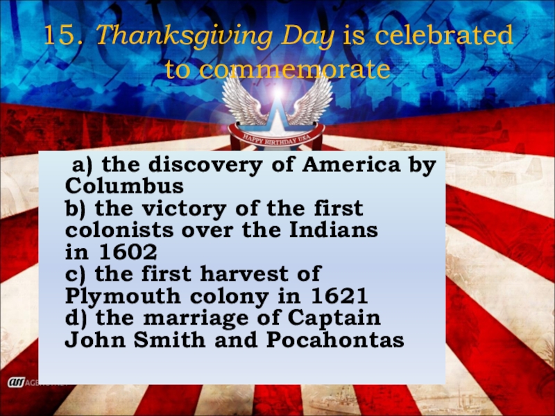 Слайд 1615. Thanksgiving Day is celebrated to commemorate