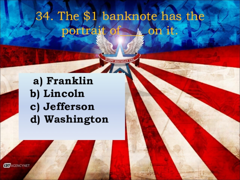 Слайд 3534. The $1 banknote has the portrait of____ on it.