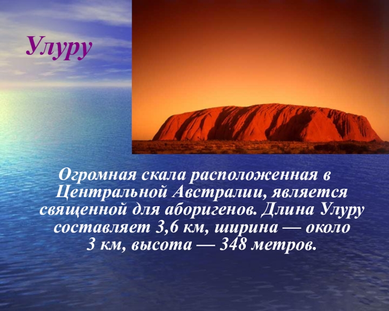 УлуруОгромная скала расположенная в Центральной Австралии, является священной для аборигенов. Длина Улуру составляет 3,6 км, ширина — около 3 км,