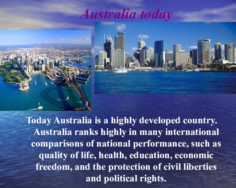 Australia todayToday Australia is a highly developed country. Australia ranks highly in many international comparisons of