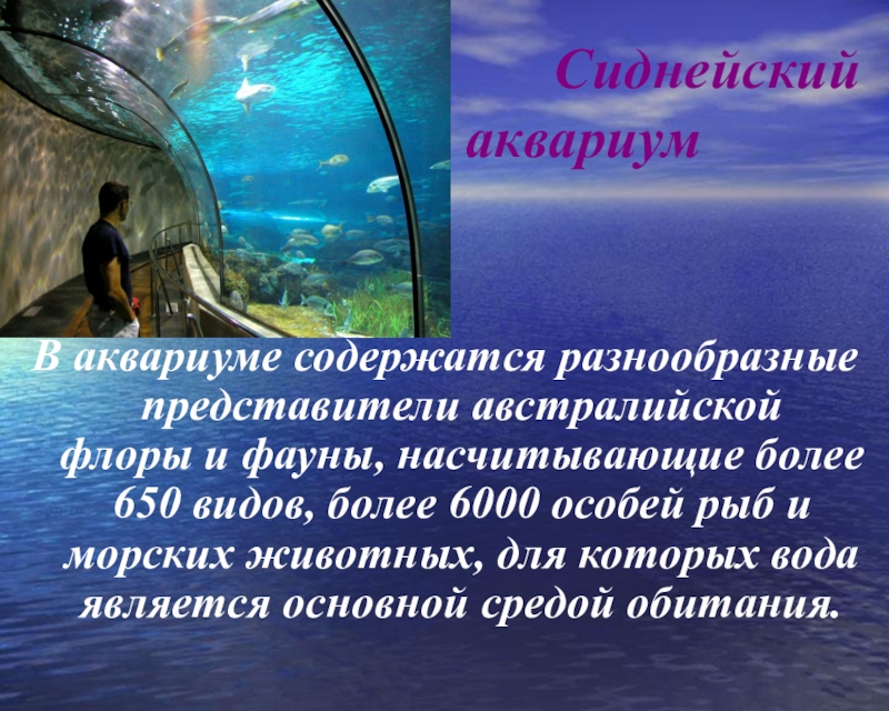 Сиднейский аквариумВ аквариуме содержатся разнообразные представители австралийской флоры и фауны, насчитывающие более 650 видов, более 6000 особей