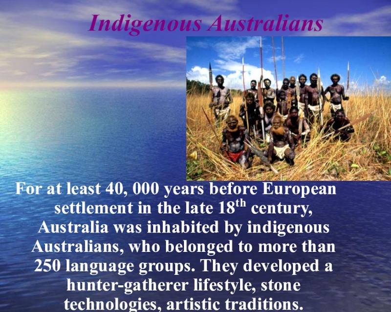 Indigenous AustraliansFor at least 40, 000 years before European settlement in the late 18th century, Australia was inhabited by indigenous Australians, who belonged to more than 250 language groups. They developed a hunter-gatherer lifestyle,