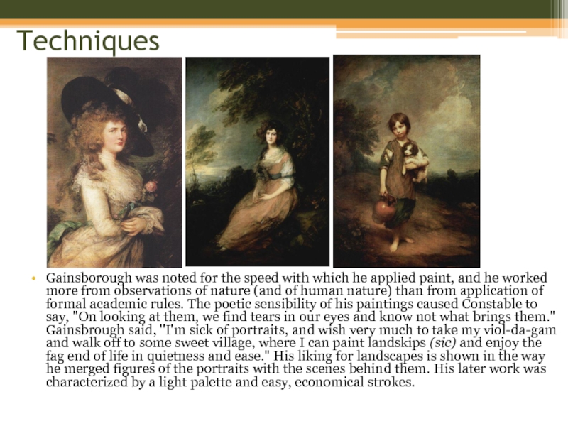 and he worked more from observations of nature (and of human nature) than from application of formal academic rules. The poetic sensibility of his paintings caused Constable to say, "On looking at them, we find tears in our eyes and know not what brings them." Gainsbrough said, "I'm sick of portraits, and wish very much to take my viol-da-gam and walk off to some sweet village, where I can paint landskips (sic) and enjoy the fag end of life in quietness and ease." His liking for landscapes is shown in the way he merged figures of the portraits with the scenes behind them. His later work was characterized by a light palette and easy, economical strokes.