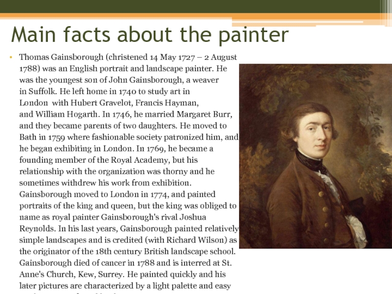 August 1788) was an English portrait and landscape painter. He was the youngest son of John Gainsborough, a weaver in Suffolk. He left home in 1740 to study art in London with Hubert Gravelot, Francis Hayman, and William Hogarth. In 1746, he married Margaret Burr, and they became parents of two daughters. He moved to Bath in 1759 where fashionable society patronized him, and he began exhibiting in London. In 1769, he became a founding member of the Royal Academy, but his relationship with the organization was thorny and he sometimes withdrew his work from exhibition. Gainsborough moved to London in 1774, and painted portraits of the king and queen, but the king was obliged to name as royal painter Gainsborough's rival Joshua Reynolds. In his last years, Gainsborough painted relatively simple landscapes and is credited (with Richard Wilson) as the originator of the 18th century British landscape school. Gainsborough died of cancer in 1788 and is interred at St. Anne's Church, Kew, Surrey. He painted quickly and his later pictures are characterized by a light palette and easy strokes. He preferred landscapes to portraits.