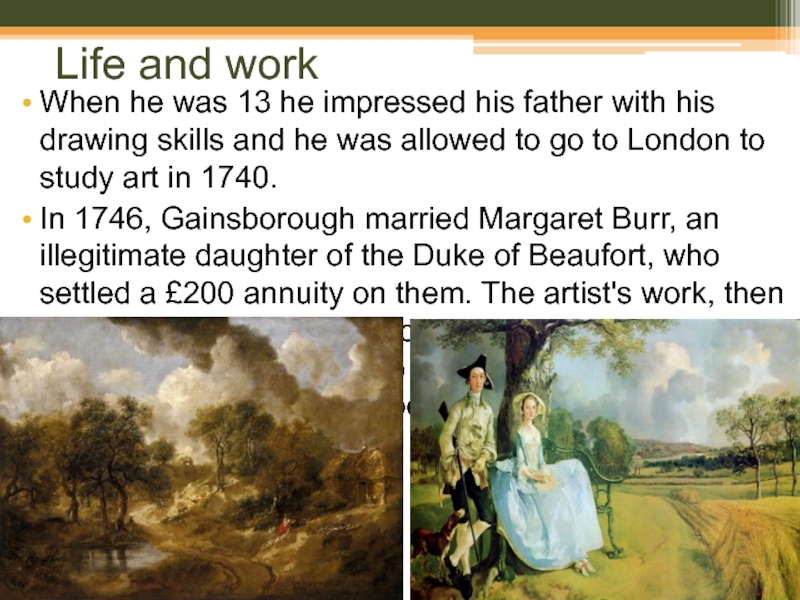 In 1746, Gainsborough married Margaret Burr, an illegitimate daughter of the Duke of Beaufort, who settled a £200 annuity on them. The artist's work, then mainly composed of landscape paintings, was not selling well. He returned to Sudbury in 1748–1749 and concentrated on painting portraits.