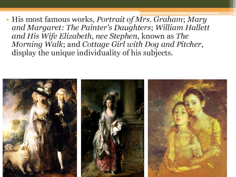 Слайд 7His most famous works, Portrait of Mrs. Graham; Mary and Margaret: The Painter's