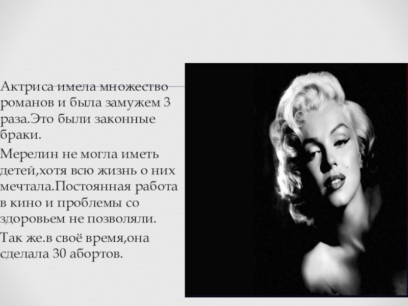 Слайд 3Актриса имела множество романов и была замужем 3 раза.Это были законные