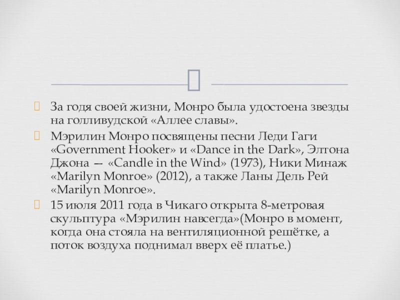 Слайд 5За годя своей жизни, Монро была удостоена звезды на голливудской «Аллее