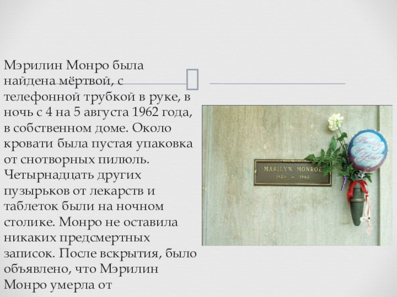 Слайд 4Мэрилин Монро была найдена мёртвой, с телефонной трубкой в руке, в