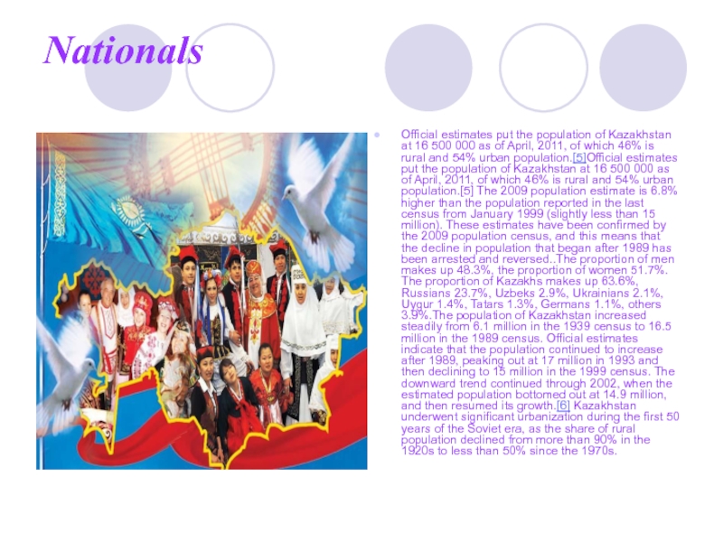as of April, 2011, of which 46% is rural and 54% urban population.[5]Official estimates put the population of Kazakhstan at 16 500 000 as of April, 2011, of which 46% is rural and 54% urban population.[5] The 2009 population estimate is 6.8% higher than the population reported in the last census from January 1999 (slightly less than 15 million). These estimates have been confirmed by the 2009 population census, and this means that the decline in population that began after 1989 has been arrested and reversed..The proportion of men makes up 48.3%, the proportion of women 51.7%. The proportion of Kazakhs makes up 63.6%, Russians 23.7%, Uzbeks 2.9%, Ukrainians 2.1%, Uygur 1.4%, Tatars 1.3%, Germans 1.1%, others 3.9%.The population of Kazakhstan increased steadily from 6.1 million in the 1939 census to 16.5 million in the 1989 census. Official estimates indicate that the population continued to increase after 1989, peaking out at 17 million in 1993 and then declining to 15 million in the 1999 census. The downward trend continued through 2002, when the estimated population bottomed out at 14.9 million, and then resumed its growth.[6] Kazakhstan underwent significant urbanization during the first 50 years of the Soviet era, as the share of rural population declined from more than 90% in the 1920s to less than 50% since the 1970s.