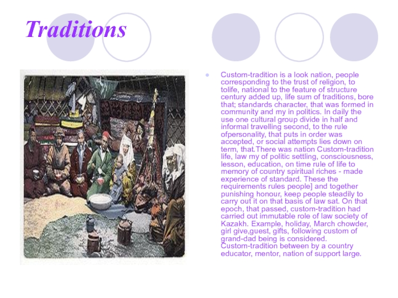 religion, to tolife, national to the feature of structure century added up, life sum of traditions, bore that; standards character, that was formed in community and my in politics. In daily the use one cultural group divide in half and informal travelling second, to the rule ofpersonality, that puts in order was accepted, or social attempts lies down on term, that.There was nation Custom-tradition life, law my of politic settling, consciousness, lesson, education, on time rule of life to memory of country spiritual riches - made experience of standard. These the requirements rules people] and together punishing honour, keep people steadily to carry out it on that basis of law sat. On that epoch, that passed, custom-tradition had carried out immutable role of law society of Kazakh. Example, holiday, March chowder, girl give,guest, gifts, following custom of grand-dad being is considered. Custom-tradition between by a country educator, mentor, nation of support large.