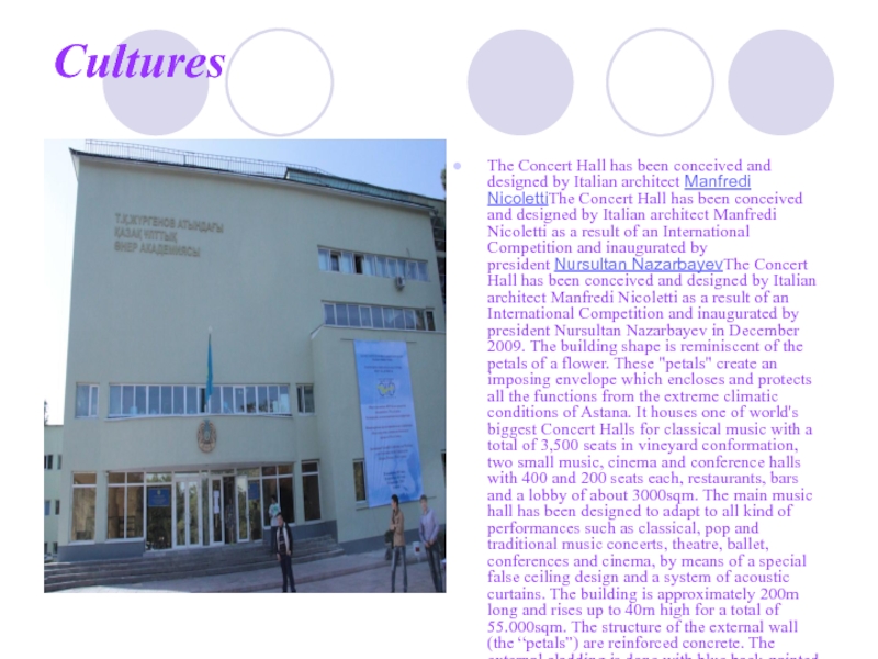 NicolettiThe Concert Hall has been conceived and designed by Italian architect Manfredi Nicoletti as a result of an International Competition and inaugurated by president Nursultan NazarbayevThe Concert Hall has been conceived and designed by Italian architect Manfredi Nicoletti as a result of an International Competition and inaugurated by president Nursultan Nazarbayev in December 2009. The building shape is reminiscent of the petals of a flower. These "petals" create an imposing envelope which encloses and protects all the functions from the extreme climatic conditions of Astana. It houses one of world's biggest Concert Halls for classical music with a total of 3,500 seats in vineyard conformation, two small music, cinema and conference halls with 400 and 200 seats each, restaurants, bars and a lobby of about 3000sqm. The main music hall has been designed to adapt to all kind of performances such as classical, pop and traditional music concerts, theatre, ballet, conferences and cinema, by means of a special false ceiling design and a system of acoustic curtains. The building is approximately 200m long and rises up to 40m high for a total of 55.000sqm. The structure of the external wall (the “petals”) are reinforced concrete. The external cladding is done with blue back-painted transparent glass panels inspired by the colour of the Kazakhstan flag.