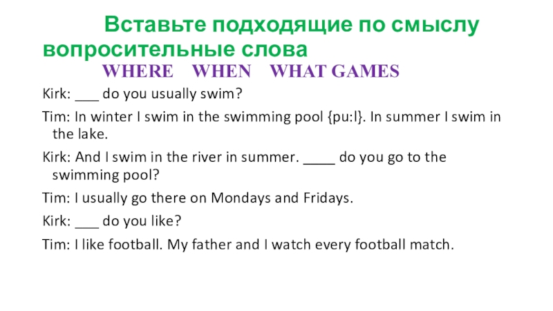 Tim: In winter I swim in the swimming pool {pu:l}. In summer I swim in the lake.