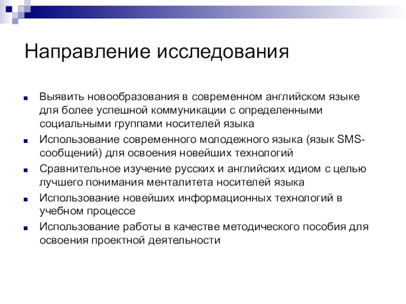 Направление исследованияВыявить новообразования в современном английском языке для более успешной коммуникации с определенными социальными группами носителей языкаИспользование