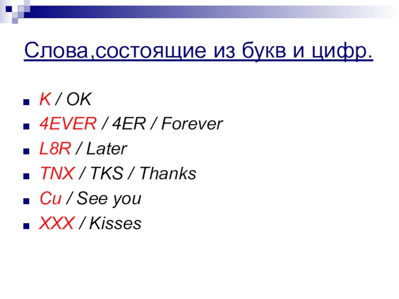 Слова,состоящие из букв и цифр.K / OK4EVER / 4ER / ForeverL8R / LaterTNX / TKS / ThanksCu