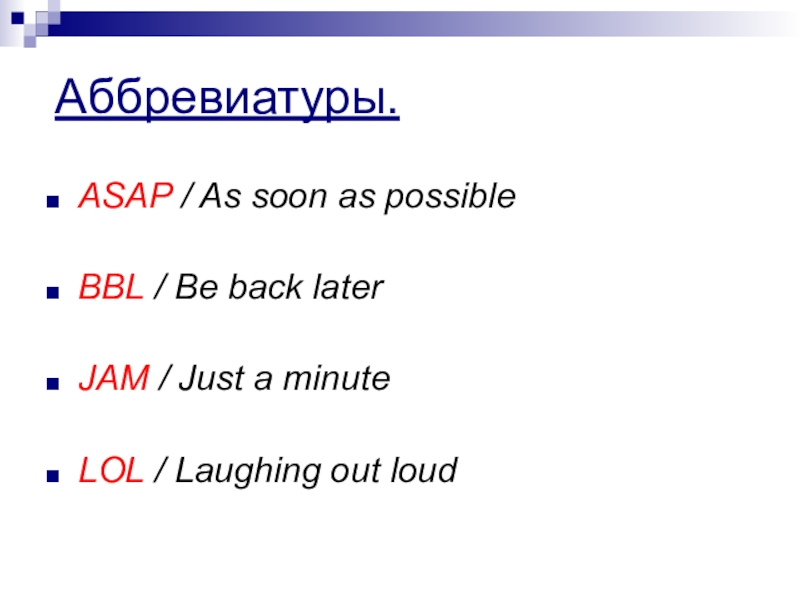 Аббревиатуры.ASAP / As soon as possibleBBL / Be back laterJAM / Just a minuteLOL / Laughing out