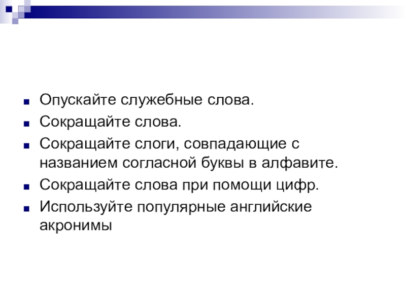 Опускайте служебные слова.Сокращайте слова.Сокращайте слоги, совпадающие с названием согласной буквы в алфавите.Сокращайте слова при помощи цифр.Используйте популярные