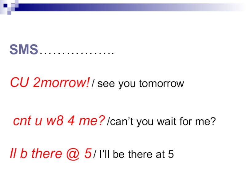 Слайд 18 SMS…………….. CU 2morrow! / see you tomorrow cnt u w8 4 me?