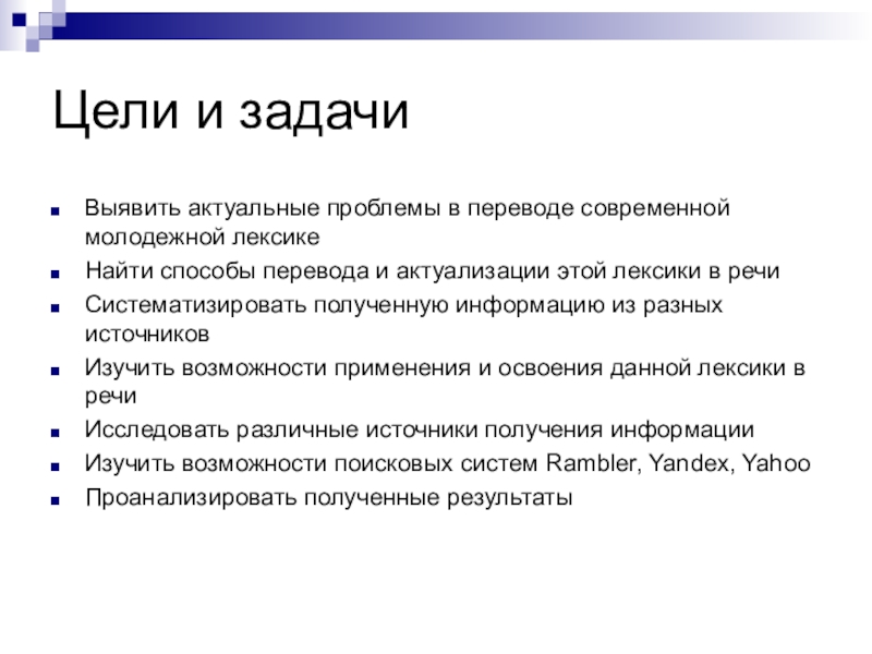 Цели и задачиВыявить актуальные проблемы в переводе современной молодежной лексикеНайти способы перевода и актуализации этой лексики в речиСистематизировать полученную информацию из разных источниковИзучить возможности применения и освоения данной лексики в речиИсследовать различные источники получения информацииИзучить возможности