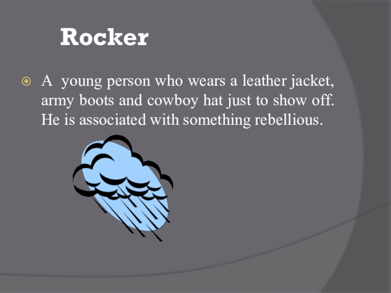 Rocker A young person who wears a leather jacket, army boots and cowboy hat just to show