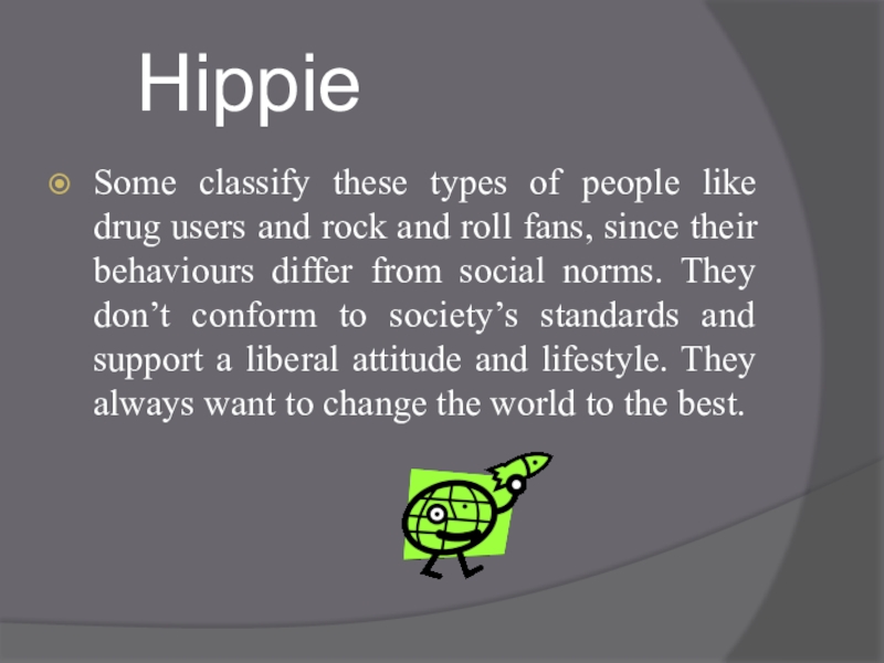 HippieSome classify these types of people like drug users and rock and roll fans, since their behaviours