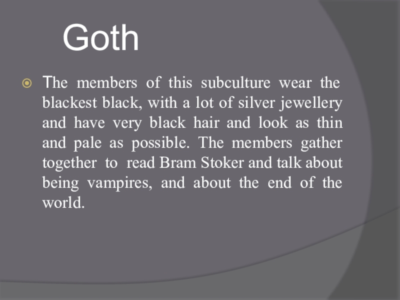 GothThe members of this subculture wear the blackest black, with a lot of silver jewellery and have