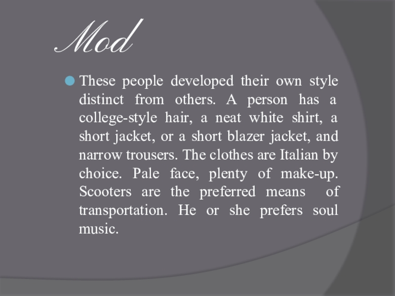 ModThese people developed their own style distinct from others. A person has a college-style hair, a neat
