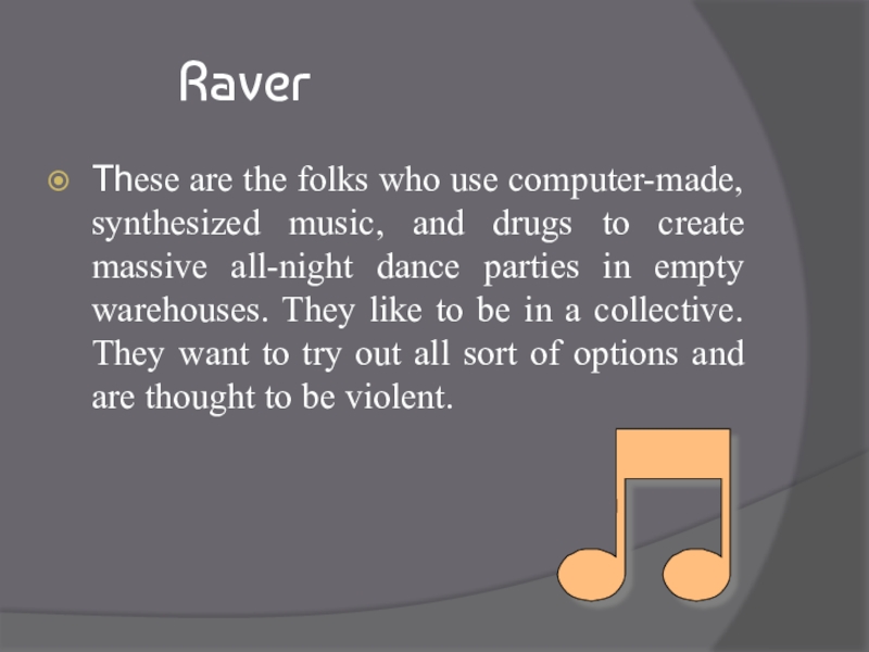 to create massive all-night dance parties in empty warehouses. They like to be in a collective. They want to try out all sort of options and are thought to be violent.