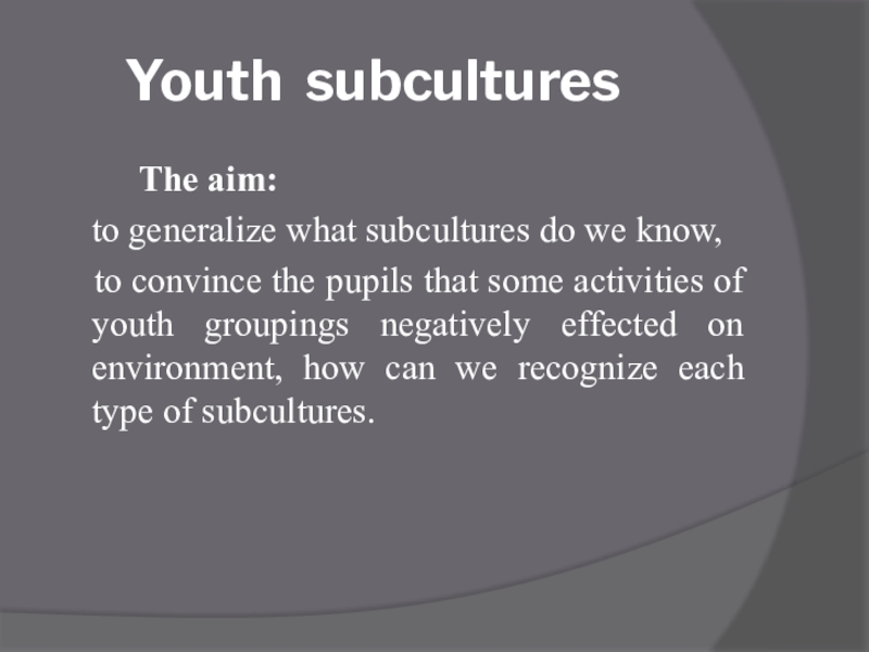 Youth subcultures The aim: to generalize what subcultures do we know, to convince the pupils that some activities of youth groupings negatively effected on environment, how can we recognize each type of