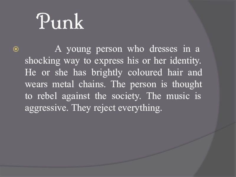 shocking way to express his or her identity. He or she has brightly coloured hair and wears metal chains. The person is thought to rebel against the society. The music is aggressive. They reject everything.