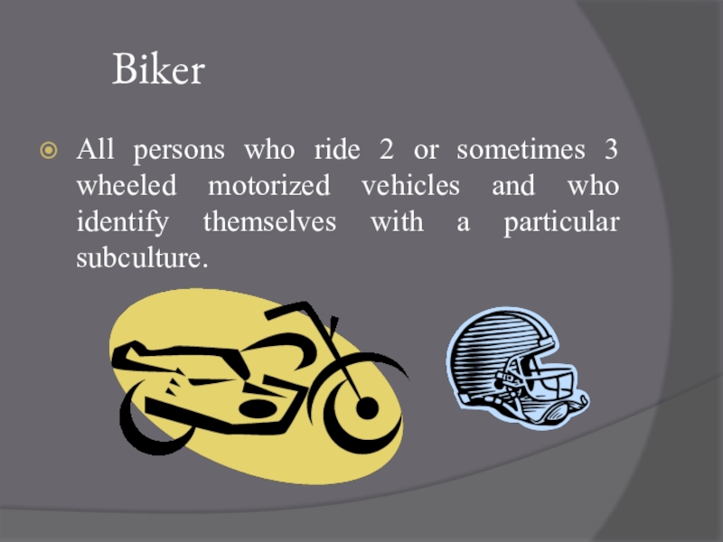 BikerAll persons who ride 2 or sometimes 3 wheeled motorized vehicles and who identify themselves with a