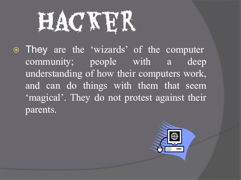 HackerThey are the ‘wizards’ of the computer community; people with a deep understanding of how their computers