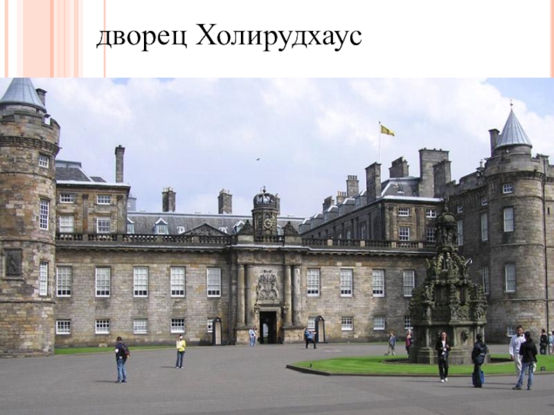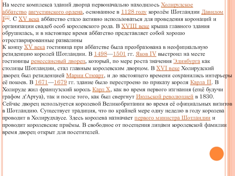 К концу XV века гостиница при аббатстве была преобразована в неофициальную резиденцию королей Шотландии. В 1498—1501 гг. Яков IV выстроил на месте гостиницы ренессансный дворец, который, по мере роста значения Эдинбурга как столицы Шотландии, стал главным королевским дворцом. В XVI веке Холирудский дворец был резиденцией Марии Стюарт, и до настоящего времени сохранились интерьеры её покоев. В 1671—1679 гг. здание было перестроено по приказу короля Карла II. В Холируде жил французский король Карл X, как во время первого изгнания (ещё будучи графом д'Артуа), так и после того, как был свергнут Июльской революцией в 1830.