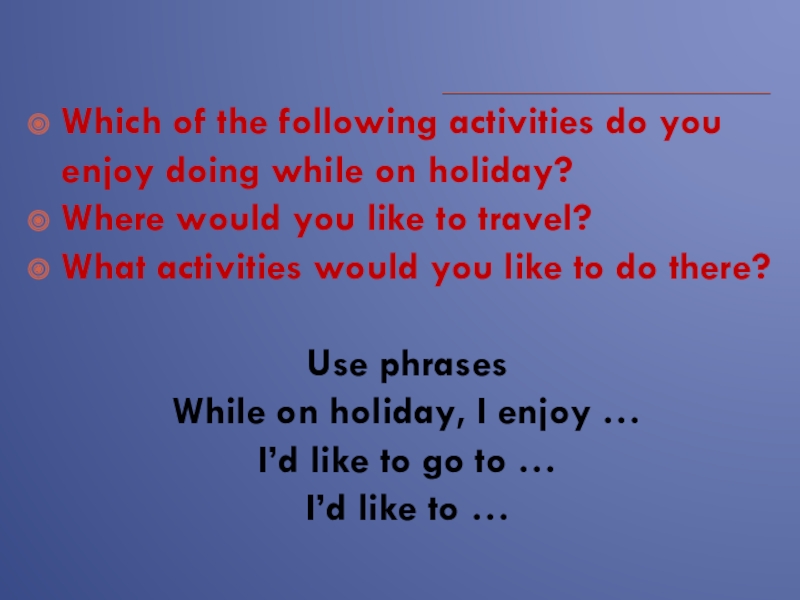 Which of the following activities do you enjoy doing while on holiday?Where would you like to travel?What