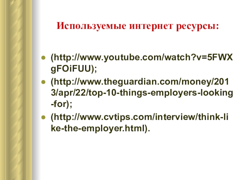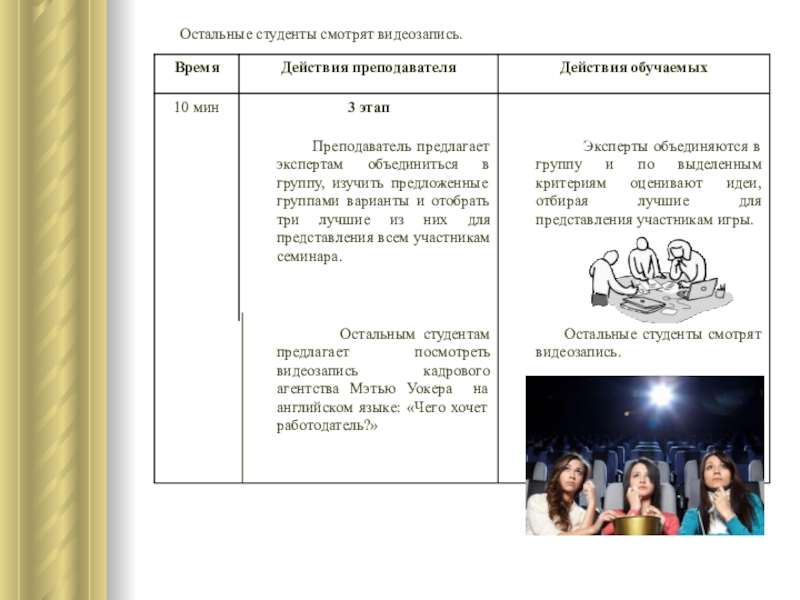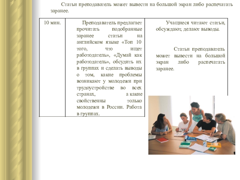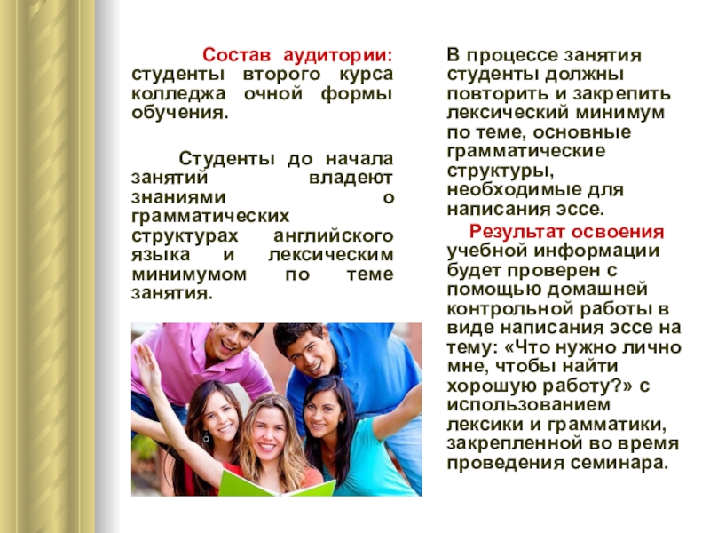 Результат освоения учебной информации будет проверен с помощью домашней контрольной работы в виде написания эссе на тему: «Что нужно лично мне, чтобы найти хорошую работу?» с использованием лексики и грамматики, закрепленной во время проведения семинара.