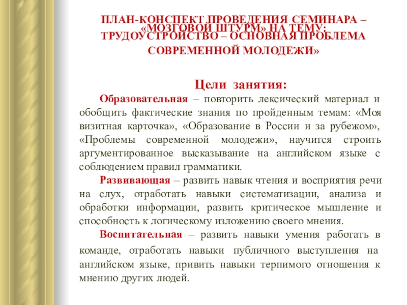 Образовательная – повторить лексический материал и обобщить фактические знания по пройденным темам: «Моя визитная карточка», «Образование в России и за рубежом», «Проблемы современной молодежи», научится строить аргументированное высказывание на английском языке с соблюдением правил грамматики.