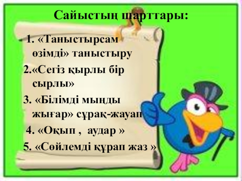 Сайыстың шарттары:  1. «Таныстырсам өзімді» таныстыру2.«Сегіз қырлы бір сырлы»3. «Білімді мыңды жығар» сұрақ-жауап 4. «Оқып ,