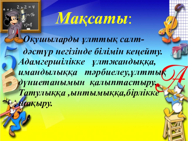 Мақсаты:   Оқушыларды ұлттық салт-   дәстүр негізінде білімін кеңейту.  Адамгершілікке  ұлтжандыққа, имандылыққа