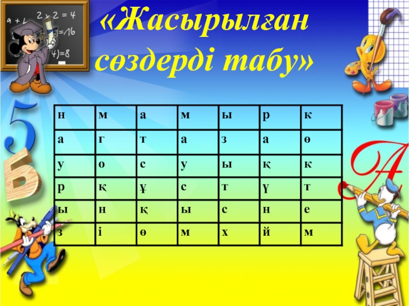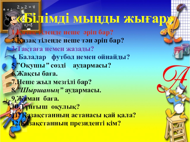 «Білімді мыңды жығар» 1.Қазақ тіленде неше әріп бар?2.Қазақ тіленде неше тән әріп бар?3.Тақтаға немен жазады?4. Балалар