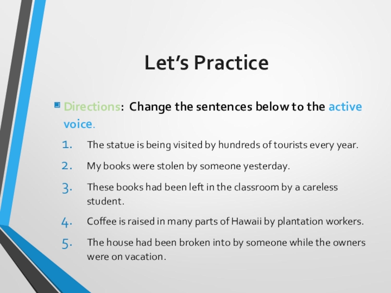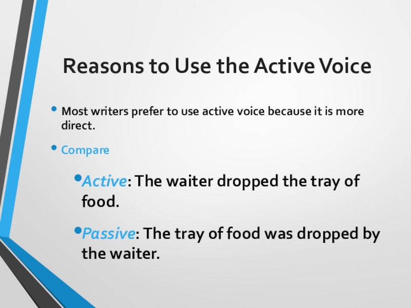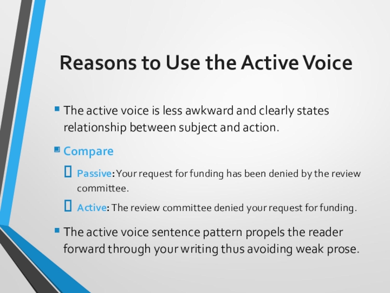The active voice sentence pattern propels the reader forward through your writing thus avoiding weak prose.